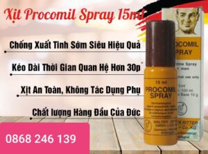 Hướng dẫn sử dụng Thuốc xịt Procomil . Khi dương vật đã cương cứng (hoặc ở trang thai hơi cương là tốt nhất), xịt ít nhất 1 -2 lần , nhiều nhất là 3 lần , lên khu vực phần đầu dương vật trước khi giao hợp. (Lời khuyên khi bạn dùng lần đầu là nên xịt 2 lần, nếu thấy hài lòng thì giữ nguyên mức đó, nếu thấy chưa hài lòng thì lần tiếp theo xịt 3 cái, hoặc ngược lại, thì điều chỉnh giảm xuống 1 lần.